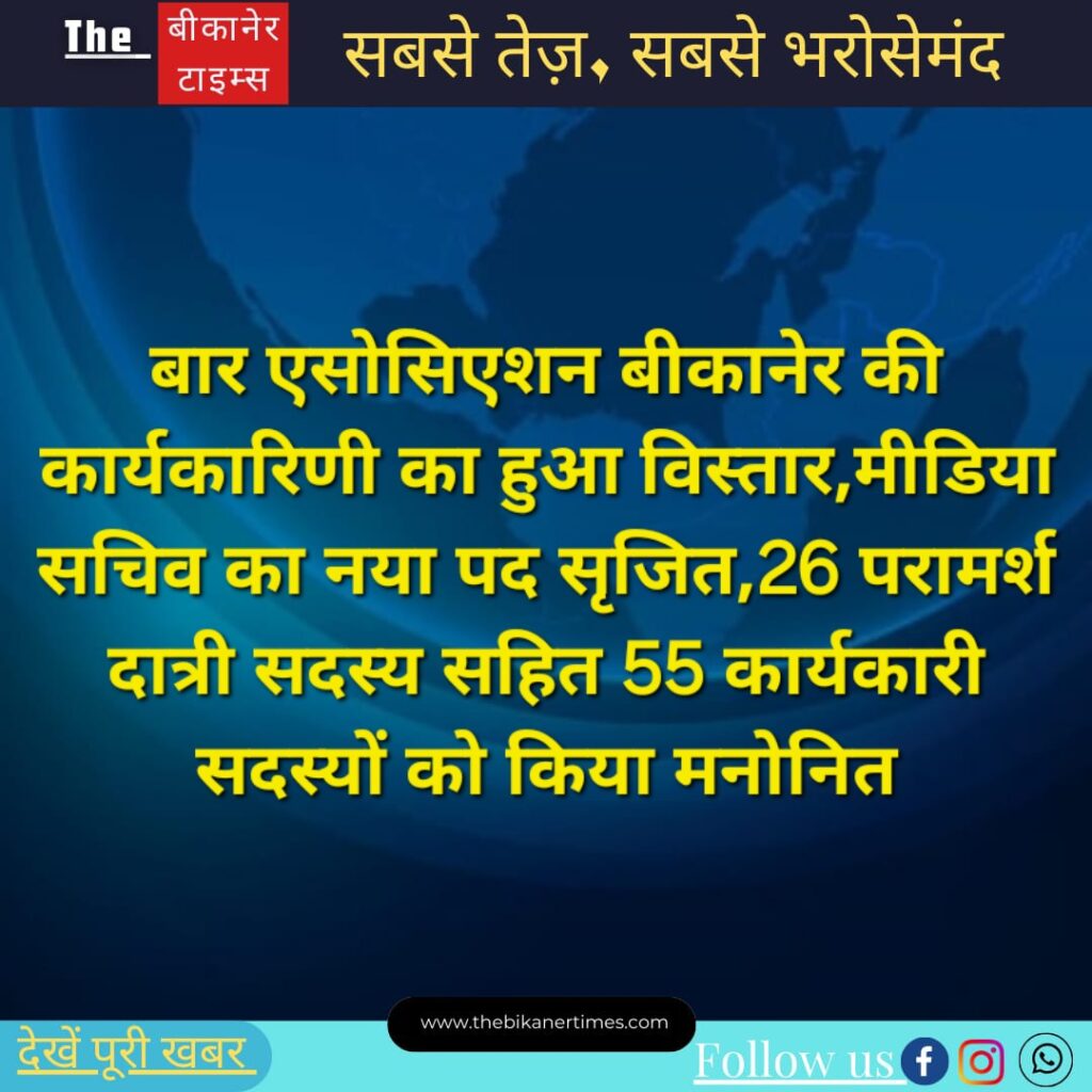 The Bikaner Times – बार एसोसिएशन बीकानेर की कार्यकारिणी का हुआ विस्तार,मीडिया सचिव का नया पद सृजित,26 परामर्श दात्री सदस्य सहित 55 कार्यकारी सदस्यों को किया मनोनित