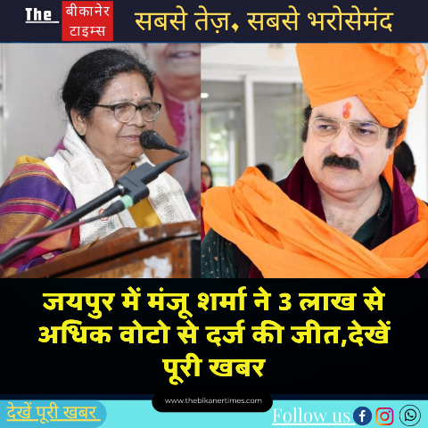 The Bikaner Times – राजस्थान में भाजपा के खाते में हालांकि 14 सीटें जाती दिख रही हैं लेकिन पहली घोषित जीत जयपुर से हैं और काफी बड़ी है। यहां भाजपा प्रत्याशी मंजू शर्मा ने कांग्रेस के पूर्व मंत्री प्रतापसिंह खाचरियावाद को 331767 वोटों से हराया। मंजू शर्मा ने 8.86 लाख वोट लिये जो वोटिंग के लगभग 60.61 प्रतिशत हैं। दूसरे नंबर पर रहे प्रतापसिंह खाचरियावास को 5.94 लाख वोट मिले।